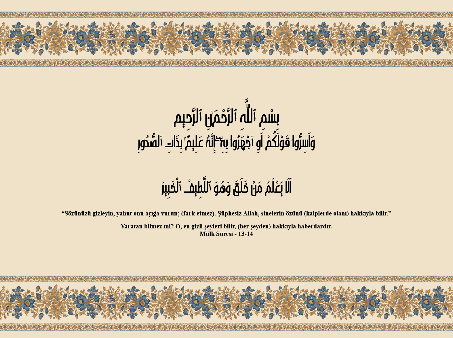 Ve esirrû kavlekum evicherû bih(bihî), innehu alîmun bi zâtis sudûr. Elâ ya’lemu men halak(halaka), ve huvel latîful habîr.